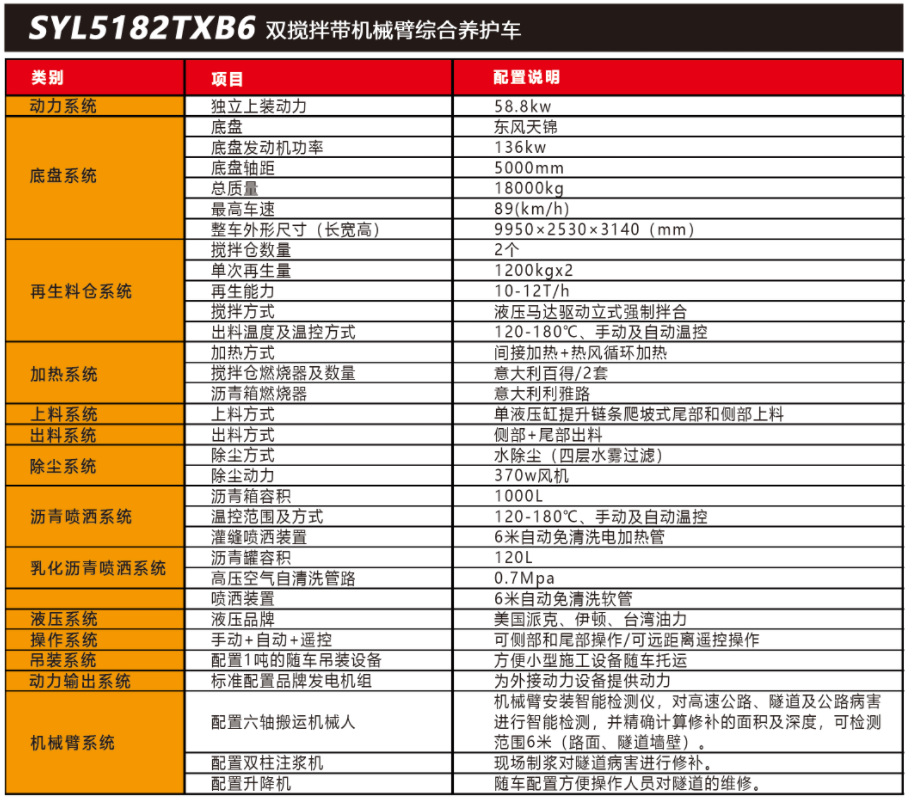 SYL5182TXB6 雙攪拌帶機(jī)械臂路面綜合養(yǎng)護(hù)車是一款集現(xiàn)場(chǎng)生產(chǎn)新瀝青混合料、瀝青路面冷料、舊料、銑刨料 100%現(xiàn)場(chǎng)加熱再生利用 ,熱瀝青灑布、裂紋跟蹤灌縫、乳化 瀝青噴灑、為其他裝置提供電力和液壓動(dòng)力等多種功能于一體的瀝青路面熱再生綜合養(yǎng)護(hù)車。配置智能隧道檢測(cè)設(shè)備 ,一車多能 ,完成對(duì)公路、隧道病害? (坑槽、裂紋等)? 進(jìn)行智能檢測(cè)和快速修補(bǔ)。可實(shí)現(xiàn)多場(chǎng)合、多路面的各種類養(yǎng)護(hù)作業(yè)。養(yǎng)護(hù)修補(bǔ)費(fèi)用低 ,作業(yè)快捷 ,高效率、節(jié)能環(huán)保性能突出等特點(diǎn)。適用于多種路況的中大施工量和高速公路中的隧道的檢測(cè)和修補(bǔ)施工。