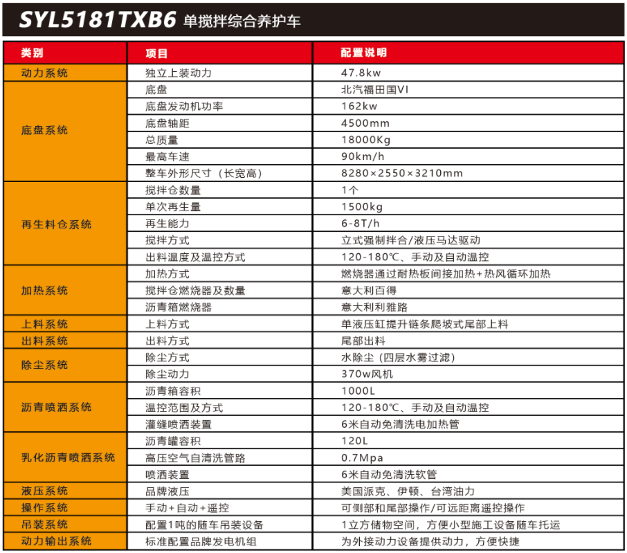 SYL5181TXB6 單攪拌綜合養(yǎng)護車是一款集現(xiàn)場生產(chǎn)新瀝青混合料、瀝青路面冷料、 舊料、銑刨料100%現(xiàn)場加熱再生利用 ,熱瀝青灑布、裂紋跟蹤灌縫、乳化瀝青噴灑、為其他裝置提供電力和液壓動力等多種功能于一體的瀝青路面熱再生綜合養(yǎng)護車??蓪崿F(xiàn)多場合、多路面的各種類養(yǎng)護作業(yè) ,養(yǎng)護修補費用低 ,作業(yè)快捷 ,高效率、節(jié)能環(huán)保性能突出等特點。適用于遠郊較寬闊區(qū)域中大施工量和高速公路的修補施工。