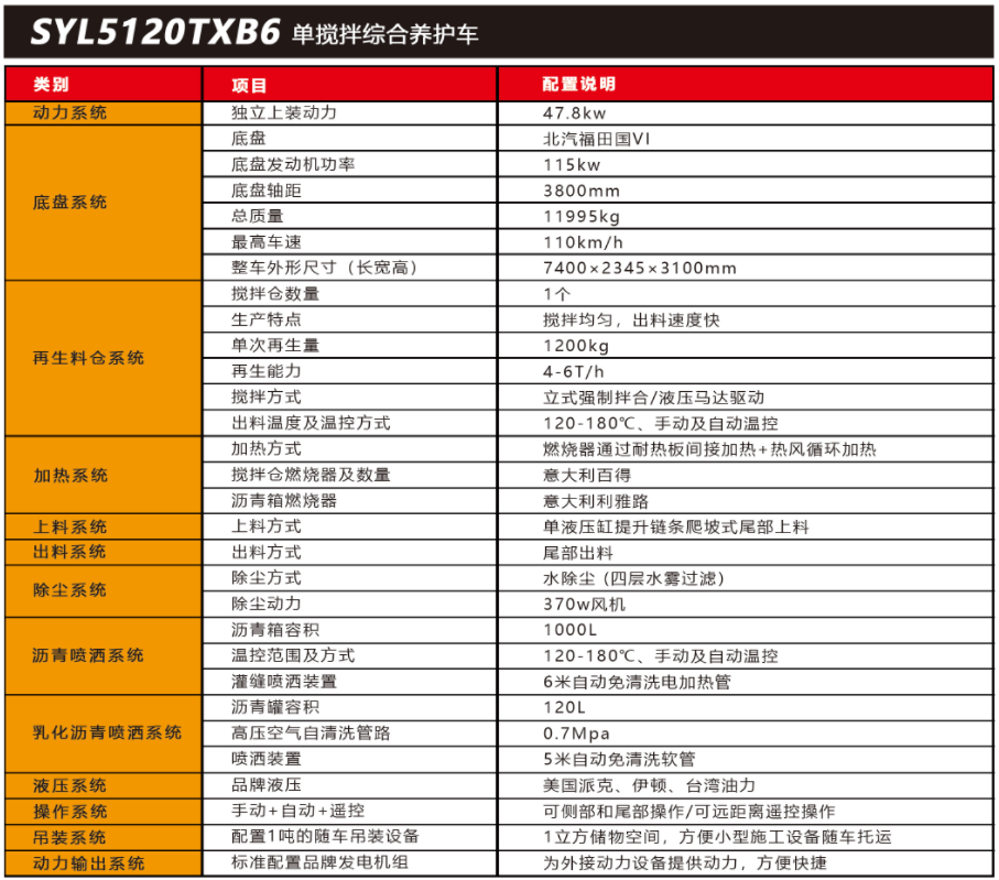 SYL5120TXB6單攪拌綜合養(yǎng)護(hù)車是一款集現(xiàn)場生產(chǎn)新瀝青混合料、瀝青路面冷料、舊料、銑刨料100%現(xiàn)場加熱再生利用 ,熱瀝青灑布、裂紋跟蹤灌縫、乳化瀝青噴灑、為其他裝置提供電力和液壓動(dòng)力等多種功能于一體的瀝青路面熱再生綜合養(yǎng)護(hù)車??蓪?shí)現(xiàn)多場合、多路面的各種類養(yǎng)護(hù)作業(yè) ,養(yǎng)護(hù)修補(bǔ)費(fèi)用低 ,作業(yè)快捷 ,高效率、節(jié)能環(huán)保性能突